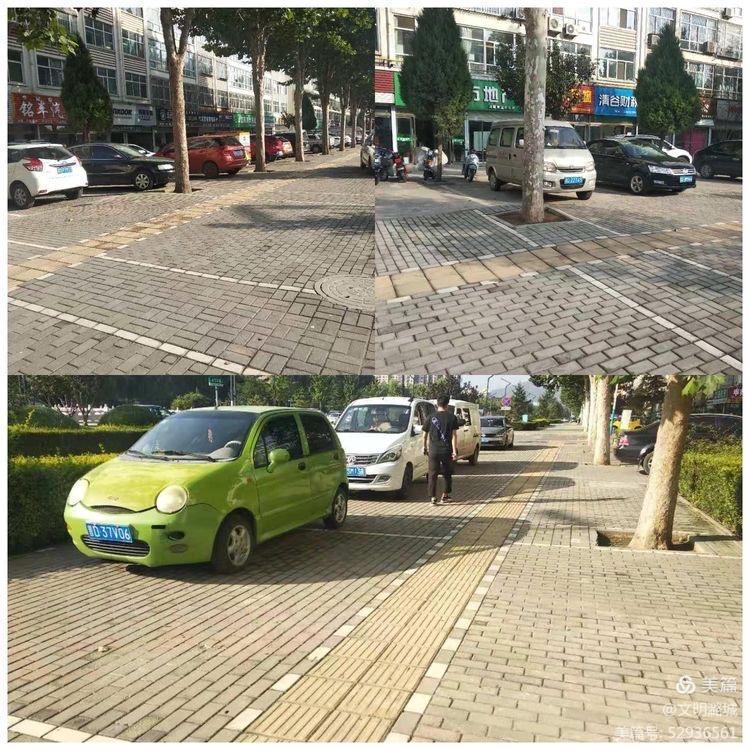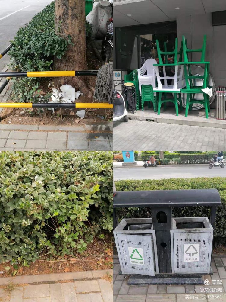 合意街情况:绿化带缺缺株缺株少株,然后绿化带内扎垃圾丛生。机动车、非机动车乱停乱放,非机动车占用盲道。部分门店出店经营。