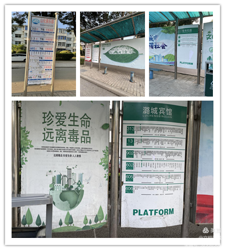 中医院对面公交站台、客都超市路北站台、潞城三中路北站台、潞康小区路南站台、潞康花园公交站台、山水生活区/金威超市站台只有单侧有公益广告