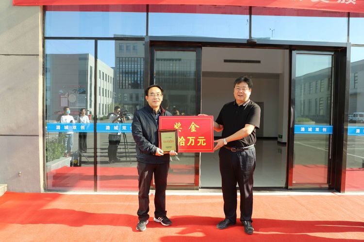 仪式上,秦苏良为韩福柱颁发“引进人才突出贡献奖”;秦苏良、崔鹏琪、韩福柱、张学良共同为潞城科技成果转化基地揭牌。