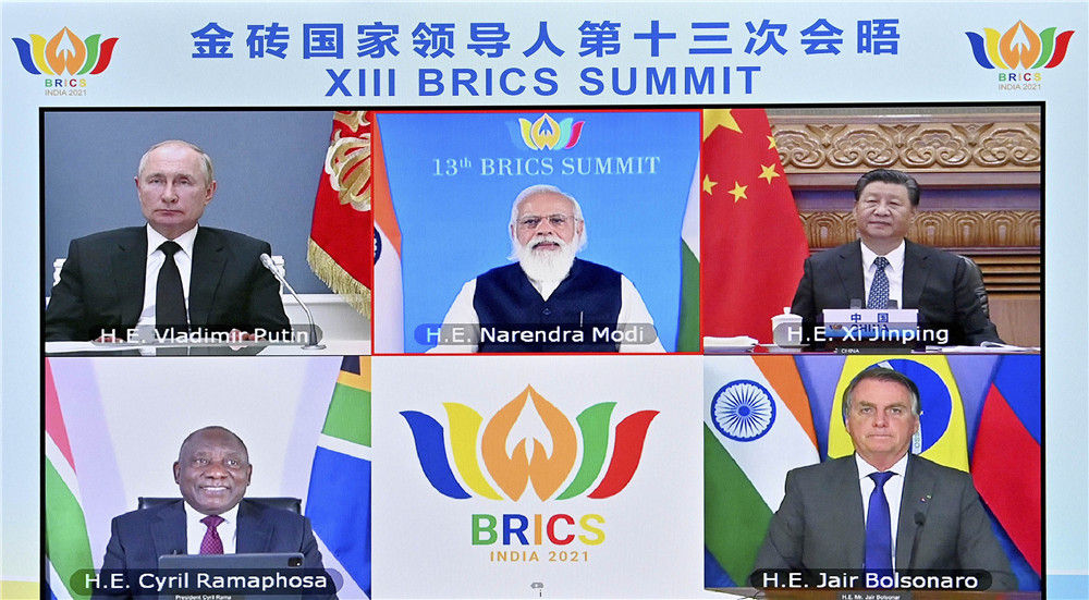 五国领导人充分肯定金砖合作15年来取得的成就,认为今年以来面对前所未有的挑战和复杂国际形势,五国携手抗击新冠肺炎疫情,推动各领域合作取得丰富成果,提升了新兴经济体国家的地位,愿继续共同努力,深化金砖战略伙伴关系,推动金砖合作取得更多务实成果。五国领导人表示,将继续推动全球团结抗疫,反对将病毒溯源政治化,愿加强公共卫生和疫苗合作,推动疫苗公平可及,促进世界经济强劲复苏,努力实现2030年可持续发展目标。各方重申支持多边主义和国际关系基本准则,反对单边主义、霸权主义,主张各国相互尊重独立、主权和平等,将就重大国际和地区问题加强沟通协调,合力应对气候变化,推动构建人类命运共同体。巴西、俄罗斯、印度和南非支持中国主办北京冬奥会、冬残奥会,支持中国2022年金砖主席国工作并主办金砖国家领导人第十四次会晤。