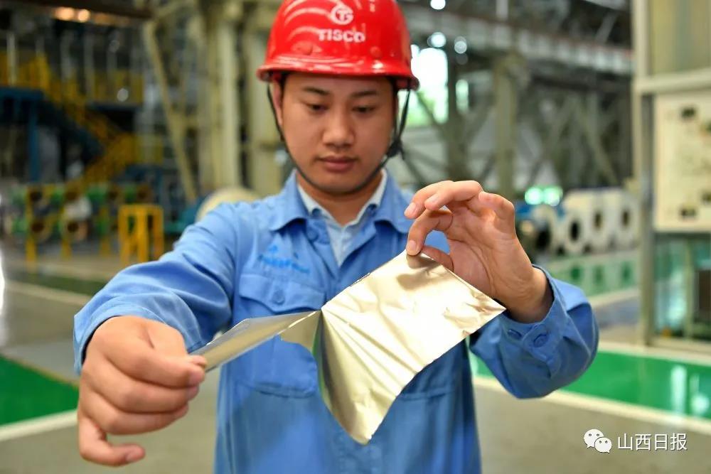 太钢集团员工在展示用手撕开0.02毫米厚的超薄带状不锈钢(2019年5月24日摄)