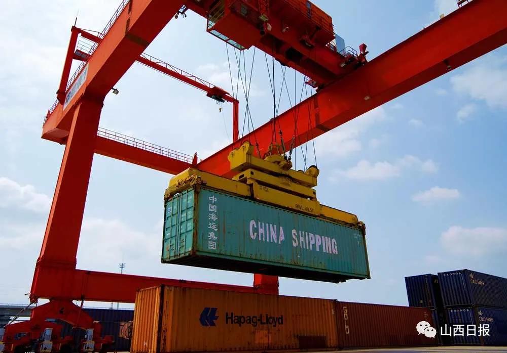 山西中鼎物流园内的龙门塔吊在运送集装箱(2021年7月29日摄)