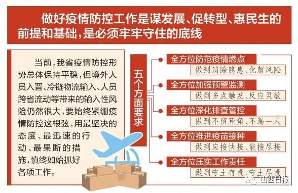 林武在讲话中指出,做好疫情防控工作是谋发展、促转型、惠民生的前提和基础,是必须牢牢守住的底线。当前,我省疫情防控形势总体保持平稳,但境外人员入晋、冷链物流输入、人员跨省流动等带来的输入性风险仍然很大,要始终紧绷疫情防控这根弦,用最坚决的态度、最迅速的行动、最果断的措施,慎终如始抓好各项工作。他提出五个方面要求。一是全方位防范疫情燃点,做到消除隐患、化解风险。要聚焦关键领域、关键环节、重点场所、重点人群,对防控工作再排查、再加固、再落实,持续抓好国际航班点对点人员转运、集中隔离医学观察等闭环管理举措,实施冷链物流全流程全链条“总仓”闭环管理,强化发热门诊筛查和院感防控,特别是紧盯学校、工厂、交通场站、人员聚集场所、密闭场所,确保防控措施环环紧扣、精准有效、不出纰漏,堵住所有可能导致疫情反弹的漏洞,坚决防止出现疫情新燃点。二是全方位加强预警监测,做到多点触发、反应灵敏。要立足更精准更有效地防,进一步提高实时分析、集中研判、预测预警能力,强化基层哨点作用,增强早期监测时效性、灵敏性,做好突发情况应对准备,做到早发现、早报告,确保第一时间反应、第一时间决策、第一时间处置。三是全方位深化排查管控,做到不留死角、不漏一人。要强化属地“第一时间、第一落点”管控责任,发挥好大数据围栏作用,全面摸排中高风险地区及关联入晋人员,落实各项管控措施,全力切断所有可能的传播途径,做到宁可十防九空,决不许失防万一。四是全方位推进疫苗接种,做到应接快接、能接尽接。要加大疫苗采购和调配力度,强化全链条全流程质量监管,提高接种服务的可及性、便利性,扎实做好重点人群接种工作,不断提高覆盖率,确保如期完成接种目标任务,加快构筑全人群免疫屏障。五是全方位压实工作责任,做到守土有责、守土尽责。省防控办要加强统筹调度和督促指导,各级党委和政府要扛牢疫情防控政治责任,相关部门要主动担当、各尽其责,健全完善高效运转、科学有序的疫情防控指挥和工作体系,确保压力传导到位、责任落实到人。