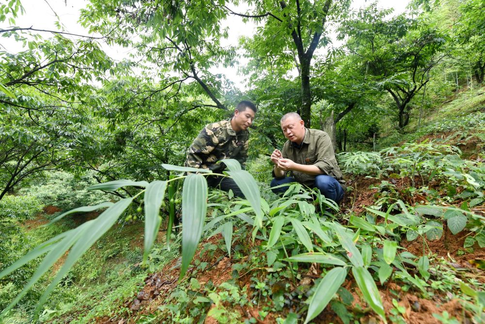 福建建瓯市林权改革发展服务中心的科技特派员陈国兴(右)在建瓯市玉山镇上房村一处林下种植园给村民讲授中药材栽培方法(5月28日摄)。新华社记者 林善传 摄