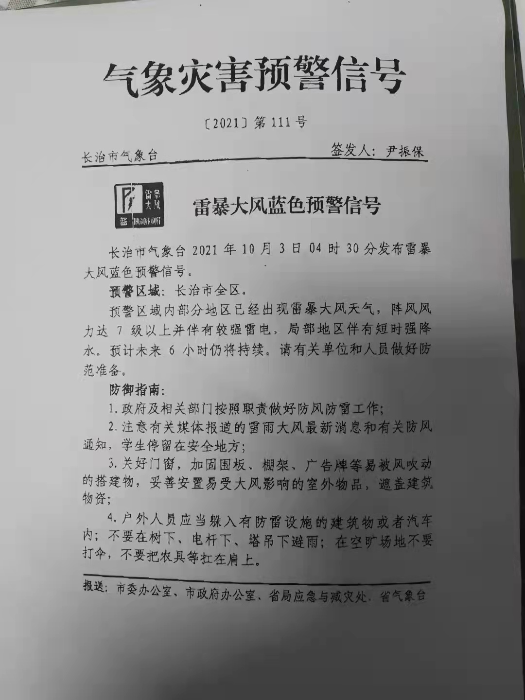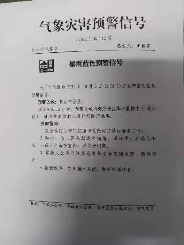 潞城区气象台2021年10月3日05时40分发布暴雨蓝色预警信号。
