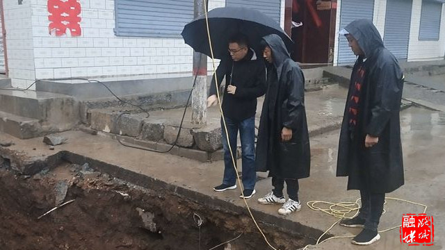 ▲微子镇相关负责人在冯村查看进村路水毁情况,研究商讨解决办法。