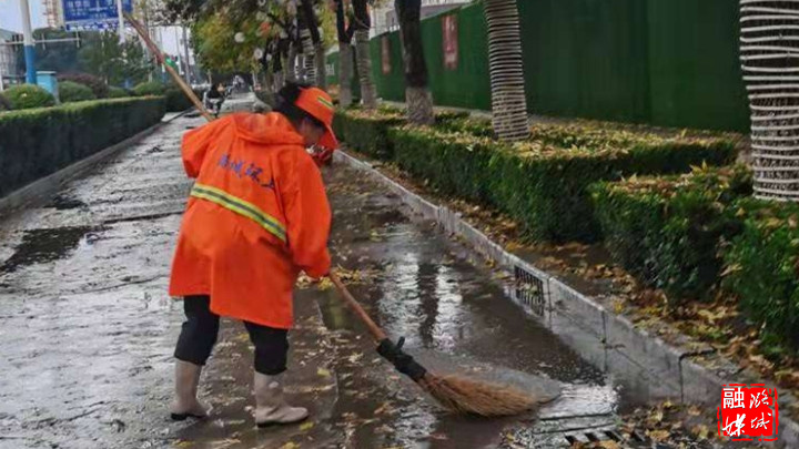 ▲区园林环卫中心工作人员坚守岗位,冒雨对背街小巷、边缘带、主干道边道等区域垃圾杂物进行地毯式排查清理。