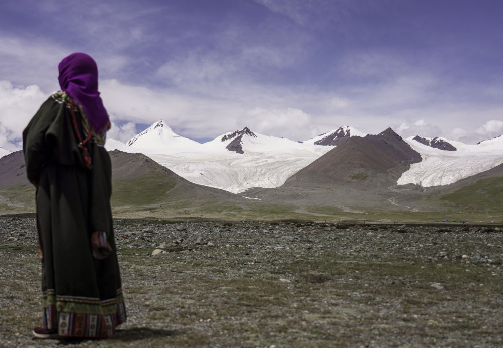 2020年8月15日,在青海省玉树藏族自治州,牧民在雪山脚下远眺岗加曲巴冰川。新华社记者吴刚摄