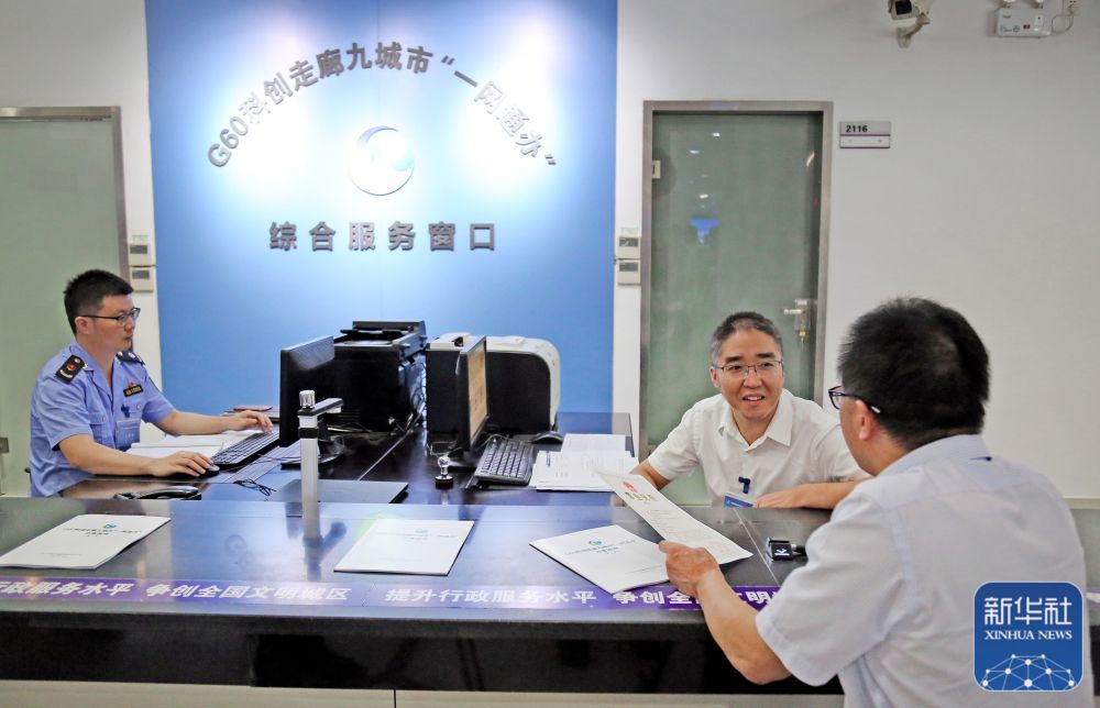 2018年9月28日,全国首批异地办理的11张营业执照和1张工业产品生产许可证在长三角G60科创走廊诞生。这是上海一家企业的工作人员在G60科创走廊九城市“一网通办”综合服务窗口咨询。新华社发(蔡斌 摄)