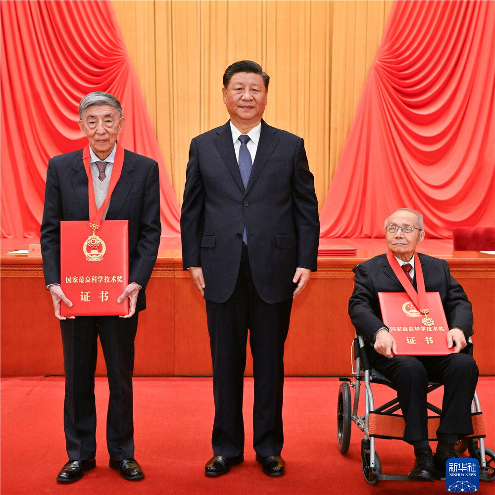 11月3日,2020年度国家科学技术奖励大会在北京人民大会堂隆重举行。中共中央总书记、国家主席、中央军委主席习近平向获得2020年度国家最高科学技术奖的中国航空工业集团有限公司顾诵芬院士(右)和清华大学王大中院士(左)颁奖。新华社记者 李学仁 摄