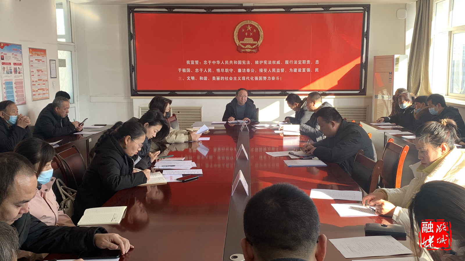 ▲潞华街道相关负责人主持召开灾后重建受损房屋开工建设情况汇报会。