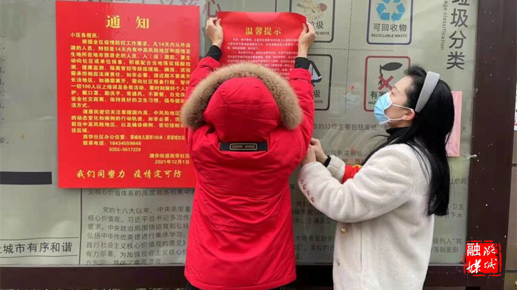 ▲潞华街道西华社区工作人员深入小区张贴疫情防控温馨提示,并排查小区疫情防控措施落实情况。