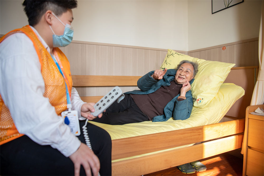 2021年12月2日,在重庆市渝北区仙桃街道养老服务中心,陈佩兰老人(右)在护理员陈傲的帮助下体验使用“智能护理床”。新华社记者 唐奕 摄