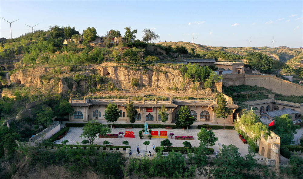 游人在陕西省榆林市米脂县杨家沟革命旧址参观(2021年9月10日摄,无人机照片)。新华社记者 陶明 摄
