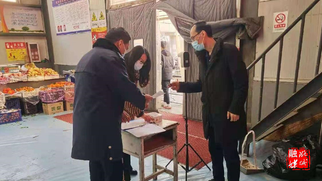▲区市场监管局相关负责人深入天脊集贸市场、客都超市天脊店、天脊宾馆等经营单位,检查疫情防控查验登记情况。