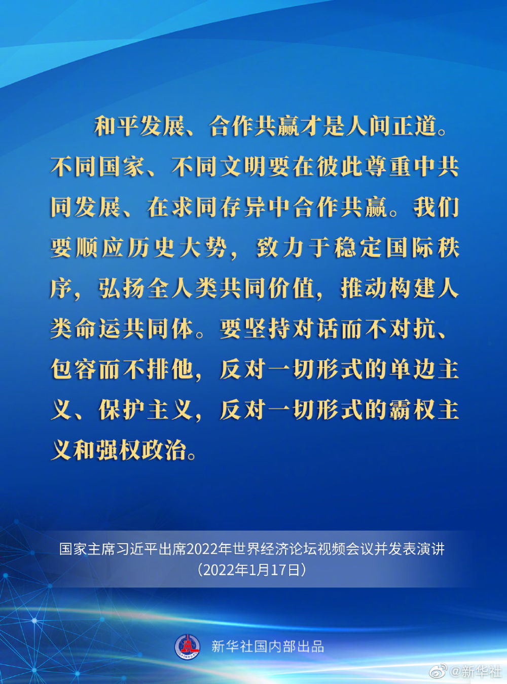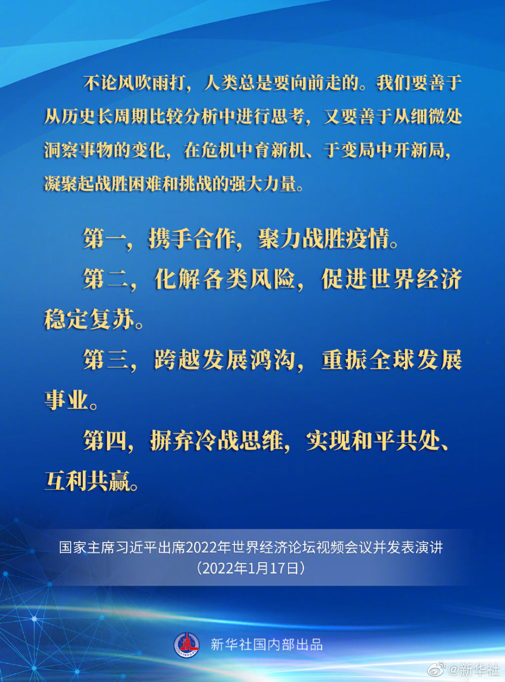 【习近平在2022年世界经济论坛视频会议上的演讲要点速览】1月17日,国家主席习近平在北京出席2022年世界经济论坛视频会议并发表演讲。一起看要点。