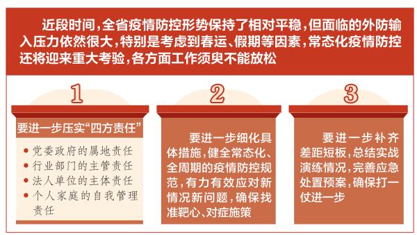 林武指出,近段时间,经过各级各部门和广大群众共同努力,全省疫情防控形势保持了相对平稳,但面临的外防输入压力依然很大,特别是考虑到春运、假期等因素,常态化疫情防控还将迎来重大考验,各方面工作须臾不能放松。要进一步压实“四方责任”,推动形成完整高效的工作体系和责任链条,确保环环紧扣、严丝合缝。要压实党委政府的属地责任,一把手要亲自抓、具体抓、从严抓,切实做到守土有责、守土担责、守土尽责。要压实行业部门的主管责任,加强统筹调度,督促有关部门各尽其责、主动担当,抓好各自领域防控措施的落实。要压实法人单位的主体责任,完善单位内重点场所重点人群疫情防控细则,严格落实扫码、测温、戴口罩日常防控“三要素”,确保守好各自阵地。要压实个人家庭的自我管理责任,引导广大群众树立“每个人都是自己健康的第一责任人”理念,按要求履行个人主动报备法律责任,坚持良好生活社交习惯,减少不必要的聚会聚集,为疫情防控大局作出贡献。林武强调,要坚决抓好国务院联防联控机制督查组反馈问题整改,以更高标准更严要求推动落实,确保第一时间整改到位。