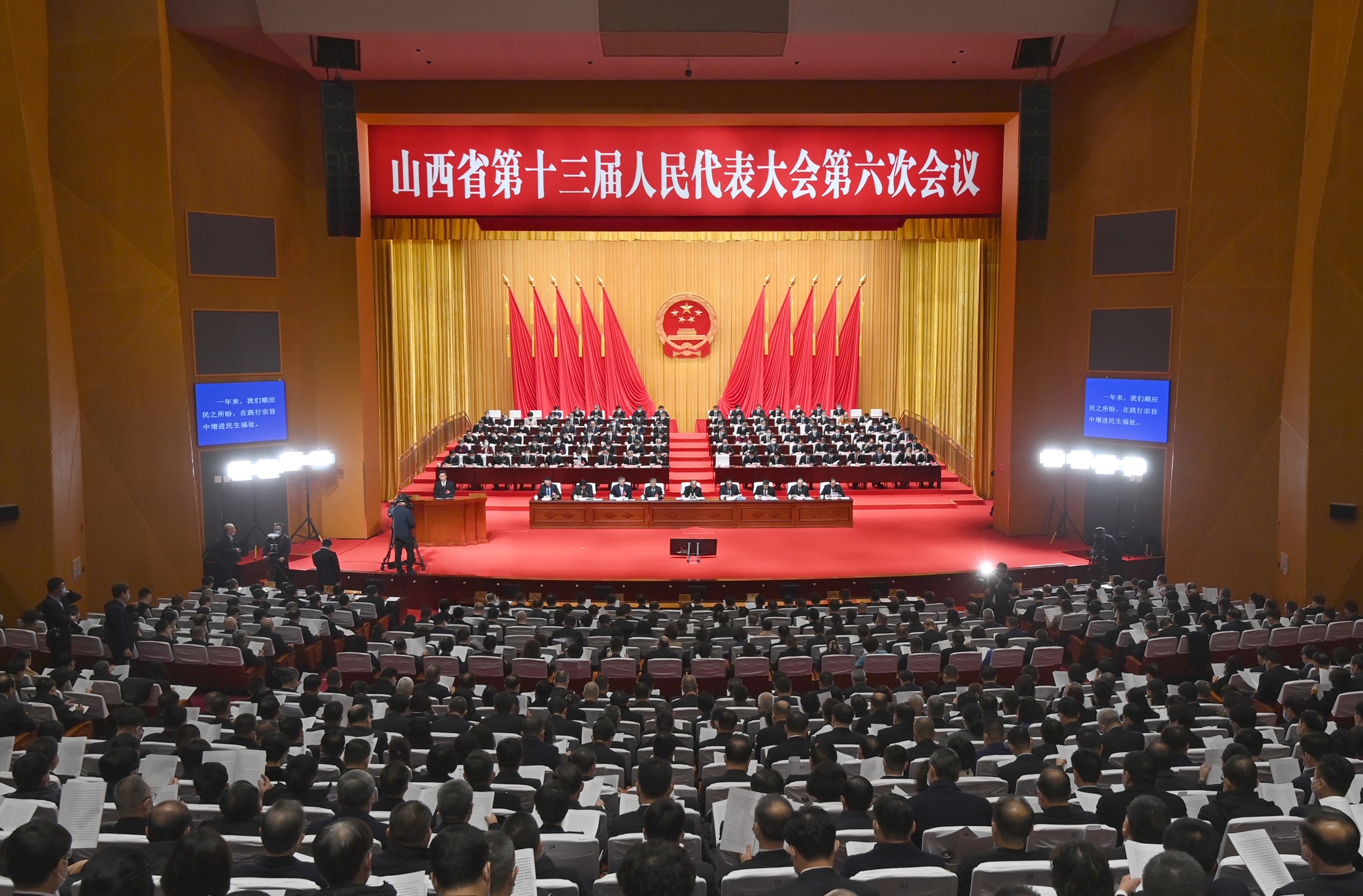 山西大剧院内气氛庄重热烈,主席台帷幕正中的国徽在鲜艳的红旗映衬下熠熠生辉。会场二楼“牢记习近平总书记嘱托 全方位推动高质量发展 奋力谱写全面建设社会主义现代化国家山西篇章”的巨幅标语,振奋人心,催人奋进。