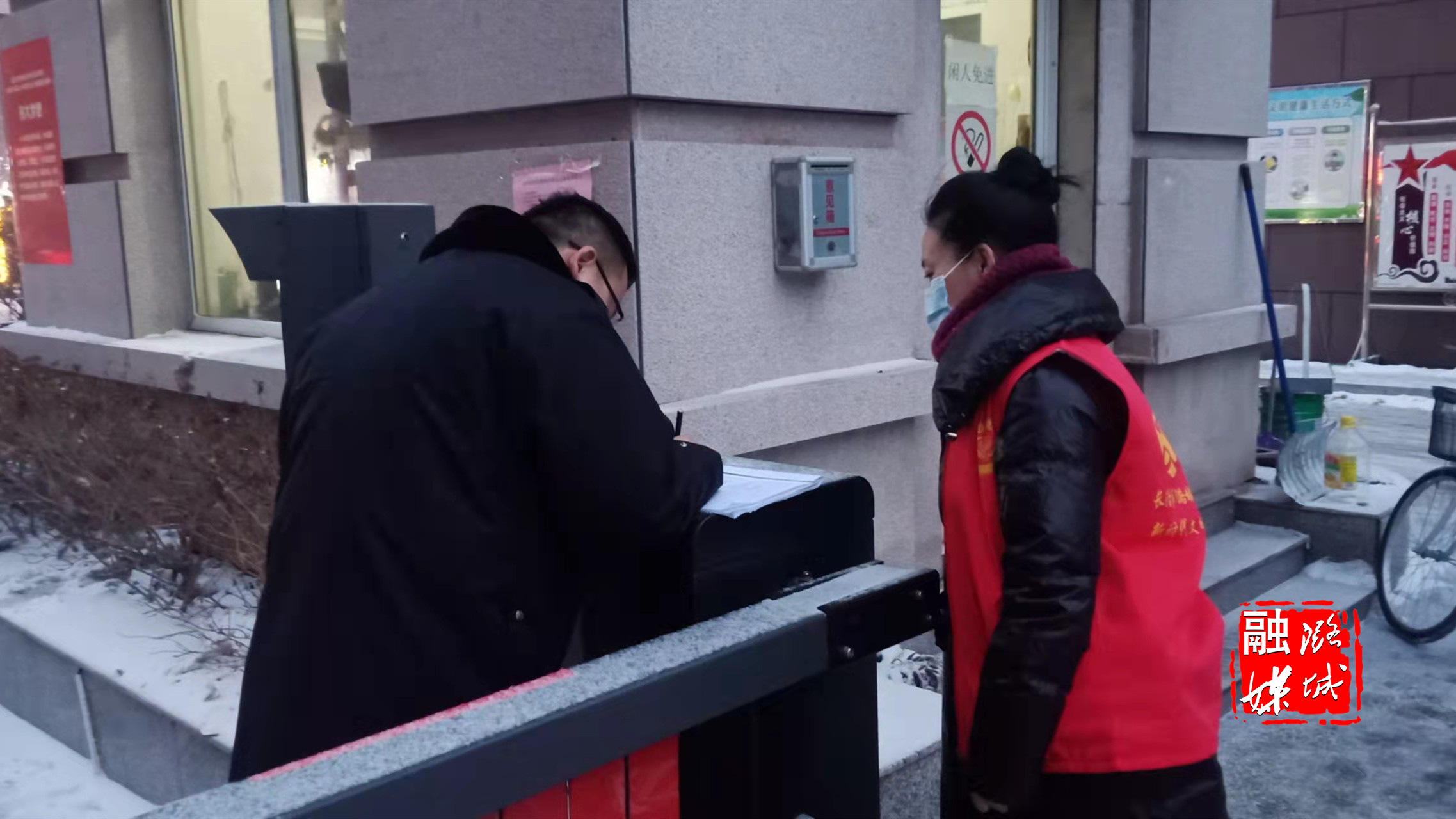 ▲区融媒体中心工作人员在包联小区——颐龙湾小区开展疫情防控值班值守,对进出入人员进行严格排查。