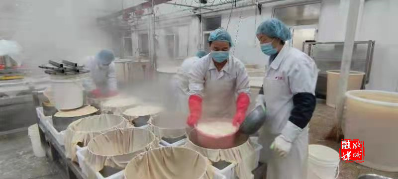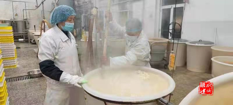 豆腐做得好不好,关键的一道工序就是“点浆”。所谓“点浆”,就是用石膏水点豆腐,水兑多了,豆腐就老了,兑少了,太嫩了,不能成形。工人师傅们把磨好的生豆液烧开搅拌均匀后,就用瓢着乳白色的、发酵四天的浆水按比例倒入豆浆里,用铲子轻轻搅匀,数分钟后,原来的豆浆就成了软软嫩嫩的豆花。浓浓的豆香味,一下子便在空气中飘散开来。
