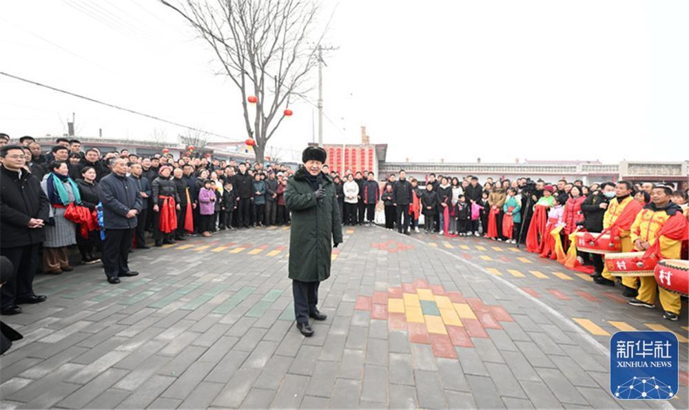 村文化广场上十分热闹,村民们打起威风锣鼓、扭起秧歌欢庆佳节。看到总书记来了,人们高兴地欢呼起来。习近平对乡亲们说,我们党的根本宗旨就是为人民群众办好事,为人民群众幸福生活拼搏、奉献、服务。我们如期打赢了脱贫攻坚战,如期实现了全面建成小康社会目标,现在踏上了全面建设社会主义现代化国家新征程。建设现代化国家离不开农业农村现代化,要继续巩固脱贫攻坚成果,扎实推进乡村振兴,让群众生活更上一层楼,在推进农业农村现代化中越走越有奔头。