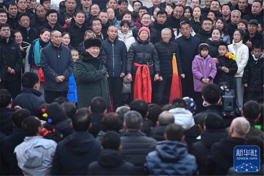 1月26日至27日,中共中央总书记、国家主席、中央军委主席习近平来到山西,看望慰问基层干部群众。这是26日下午,习近平在临汾市汾西县僧念镇段村文化广场,给乡亲们拜年,向全国各族人民、向港澳台同胞和海外侨胞致以美好的新春祝福。新华社记者 李学仁 摄