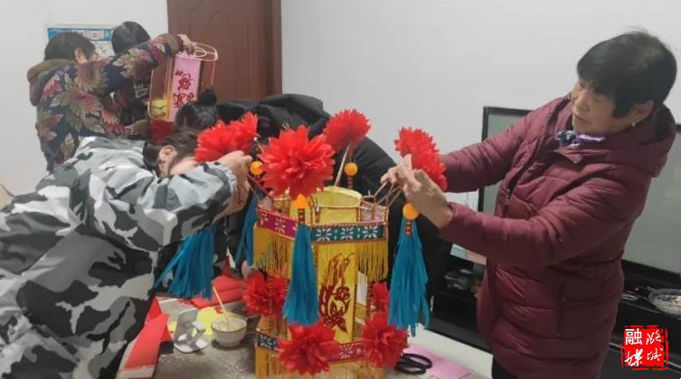 每年的正月初五过后,西流南村的刘庆琳就开始忙着买纸、扎架糊起纸灯笼来。为了让自己的灯笼也能闪烁在村子上空,今年也不例外,刘庆琳和村民们早早的就开始忙活了。她们分工不同,忙而不乱。刘庆琳的任务是制作点缀灯笼的纸花,她拿着一沓裁好尺寸的红纸,一折一捻的工夫,一朵朵纸红花便“绽放”开来:“糊花灯有六个步骤,扎架、缠柱、糊纸、剪花、挂花、挂穗,我现在正在扎花,这样装扮在花灯上更漂亮,预示着今年有一个好的兆头,希望我们能够平安健康幸福”。另一旁的大妈们,先给扎好的灯笼架糊一层红纸,再用金条纸一圈一圈地进行手工缠绕加以修饰,光是这步“缠柱”就要耗时两个小时。这期间,村民李云兰也在忙不迭地把薄如蝉翼的红纸剪成各式图案:“正月十五挂花灯,一般就是剪荷花、剪孔雀,我现在剪得是凤凰,糊到灯的每一面上,灯光映出来特别好看。”
