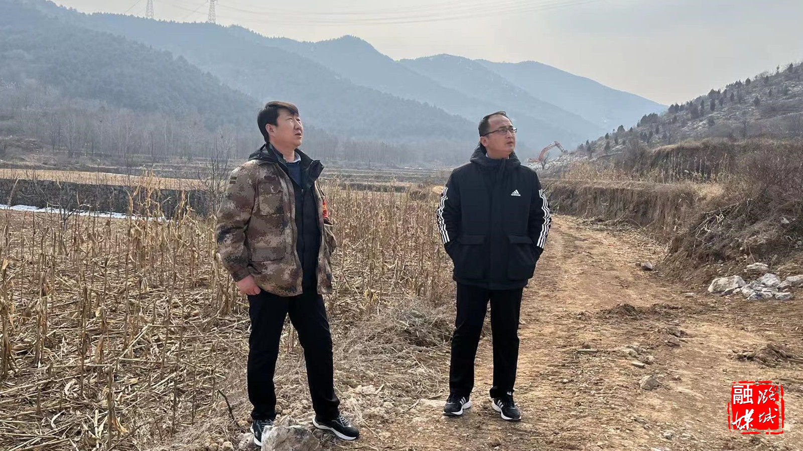 ▲成家川街道负责人到祥井村实地查看村级道路及护林防火通道工程进展情况。