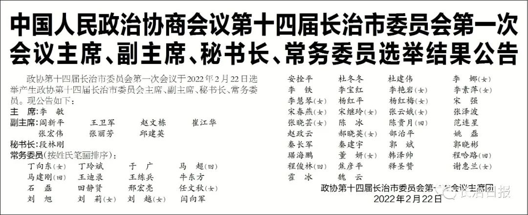 会议选举李敏为中国人民政治协商会议第十四届长治市委员会主席,选举阎新平、王卫军、赵文栋、崔江华、张宏伟、张丽芳、邱建英为中国人民政治协商会议第十四届长治市委员会副主席。选举段林刚为中国人民政治协商会议第十四届长治市委员会秘书长。选举丁向东等54人为中国人民政治协商会议第十四届长治市委员会常务委员。