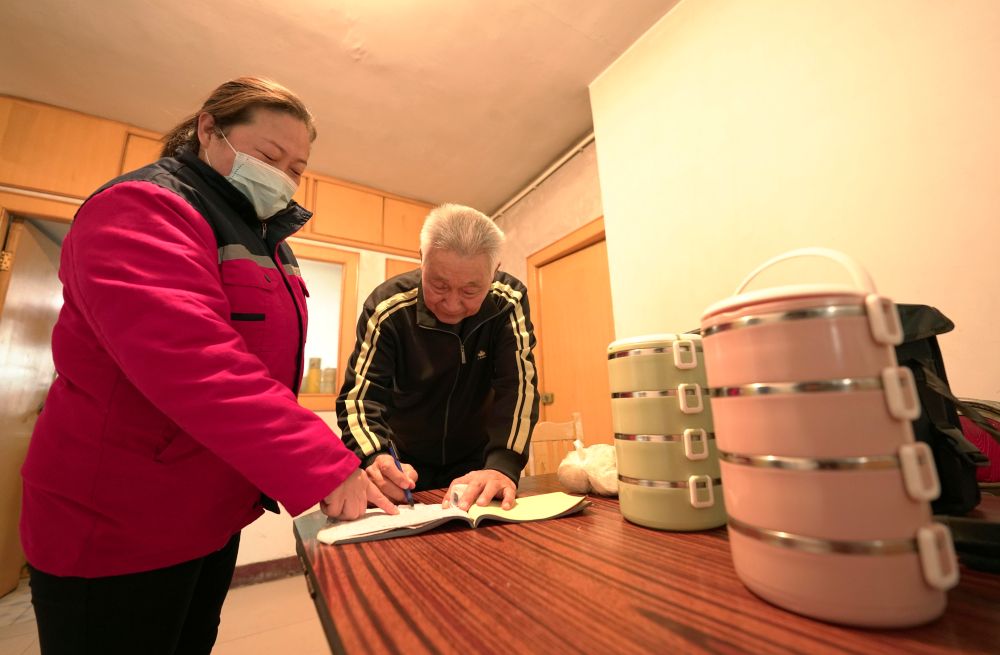 河北省邢台市康宁智慧社区养老服务中心工作人员(左)把午餐送到檀成海老人家中(2022年1月6日)。新华社发 (陈雷 摄)