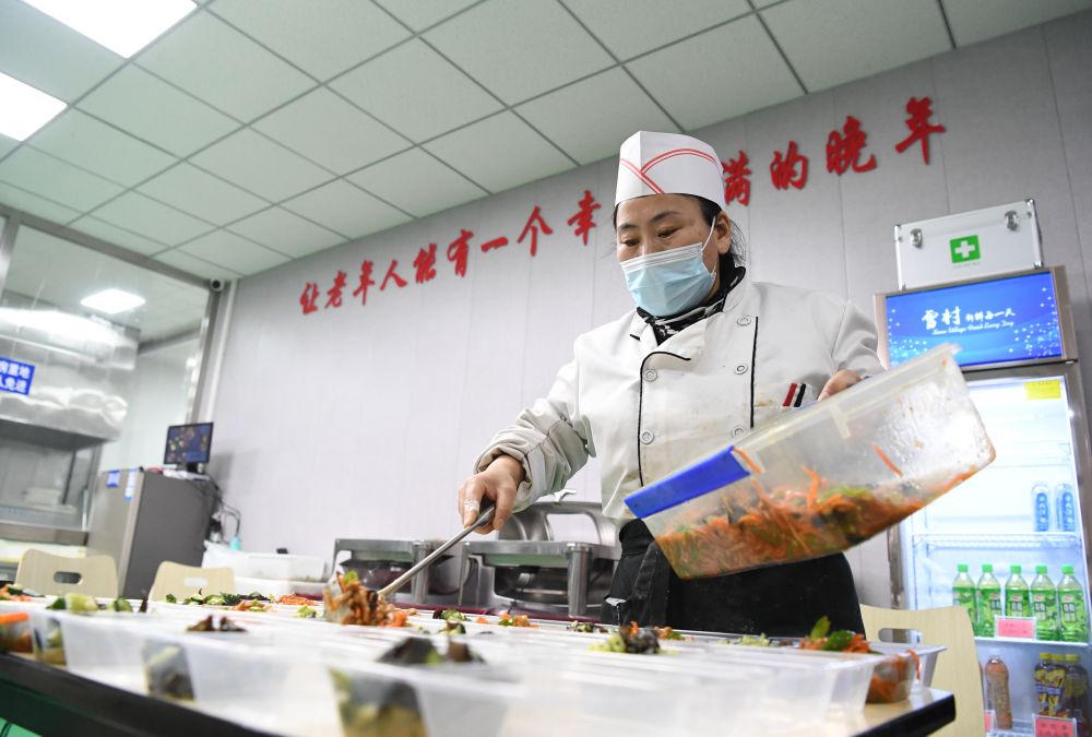 河北省承德市滨河社区老年食堂工作人员在为老人配餐(2021年12月16日)。新华社记者 朱旭东摄