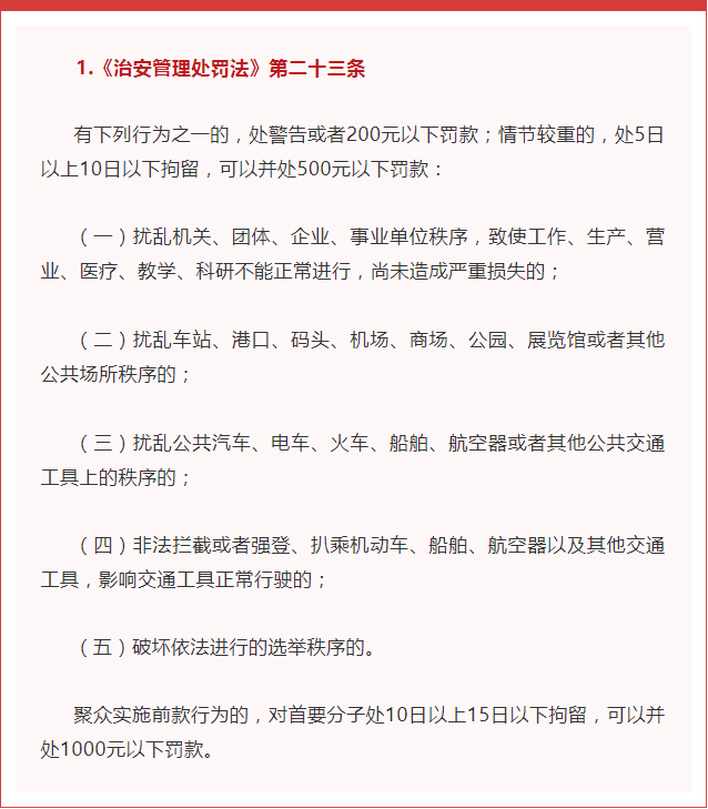 1.乘坐公共交通工具,出入小区、超市、菜市场、酒店等公共场所,拒不配合管理人员的劝导配戴口罩的,涉嫌违反《中华人民共和国治安管理处罚法》(以下简称《治安管理处罚法》)第二十三条,处警告或者200元以下罚款;情节较重的,处以5日以上10日以下拘留,可以并处500元以下罚款。引起新型冠状病毒传播或者有传播严重危险的,可能涉嫌违反《中华人民共和国刑法》(以下简称《刑法》)第三百三十条,构成妨害传染病防治罪。