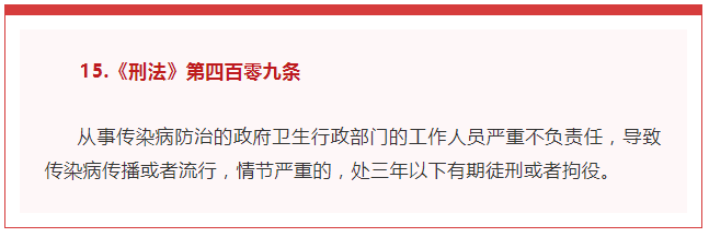 11.在预防、控制新型冠状病毒感染肺炎疫情期间,从事传染病防治的政府卫生行政部门的工作人员严重不负责任、导致新型冠状病毒肺炎传播或者流行的,情节严重的,可能涉嫌违反《刑法》第四百零九条,构成传染病防治失职罪。