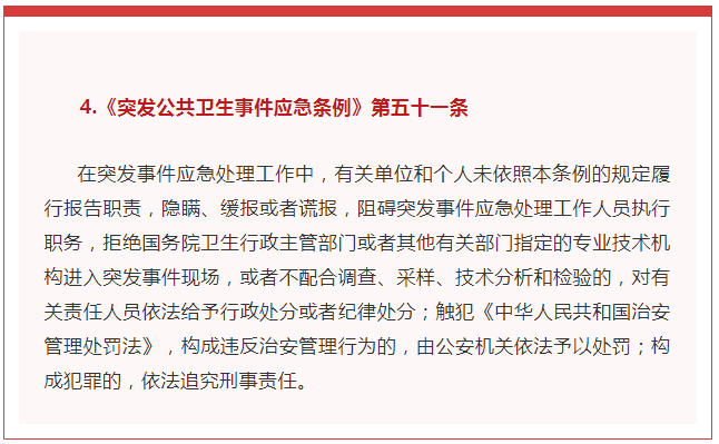 4.纳入核酸检测范围的人群,不参加统一组织的核酸检测的,涉嫌违反《突发公共卫生事件应急条例》第五十一条,有关单位和个人不配合调查、采样、技术分析和检验,可能触犯《治安管理处罚法》第五十条,构成违反治安管理行为的,将由公安机关依法予以处罚;涉嫌构成犯罪的,将依照《刑法》第三百三十条以涉嫌妨害传染病防治罪追究刑事责任。