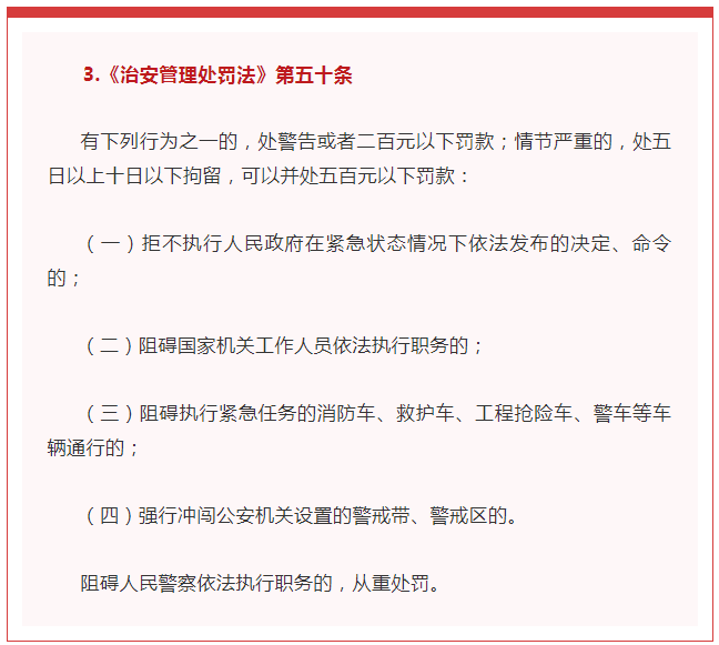 3.经过疫情防控卡点的车辆和人员,以冲卡或者其他方法,拒不配合、接受卡点工作人员检查的,涉嫌违反《治安管理处罚法》第五十条,处警告或者200元以下罚款;情节严重的,处5日以上10日以下拘留,可以并处500元以下罚款。引起新型冠状病毒传播或者有传播严重危险的,可能涉嫌违反《刑法》第三百三十条,构成妨害传染病防治罪。