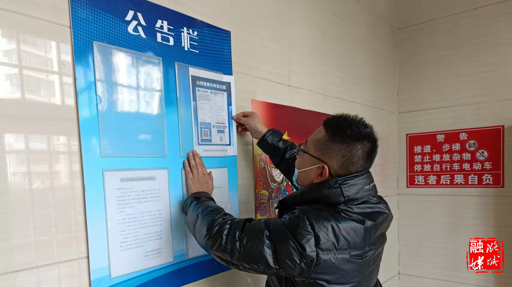 ▲区融媒体中心强化疫情防控责任落实,对包联小区所有住户严格查验“健康码”“行程码”“晋快检”三码;督促小区门店落实查“两码”,测体温,戴口罩,外来人员登记等防疫措施;加大宣传力度,张贴健康码宣传单,筑牢疫情防控安全网。