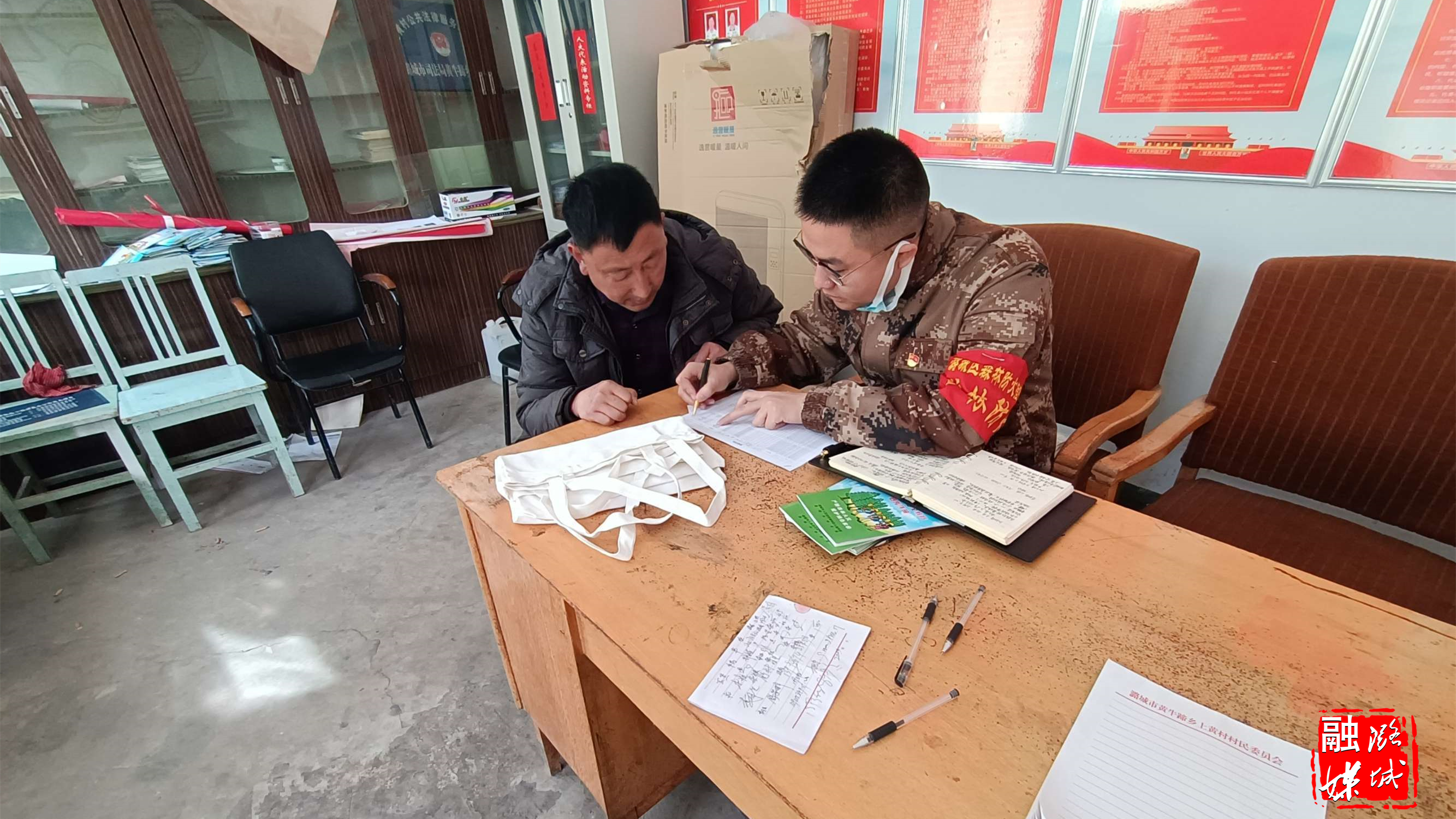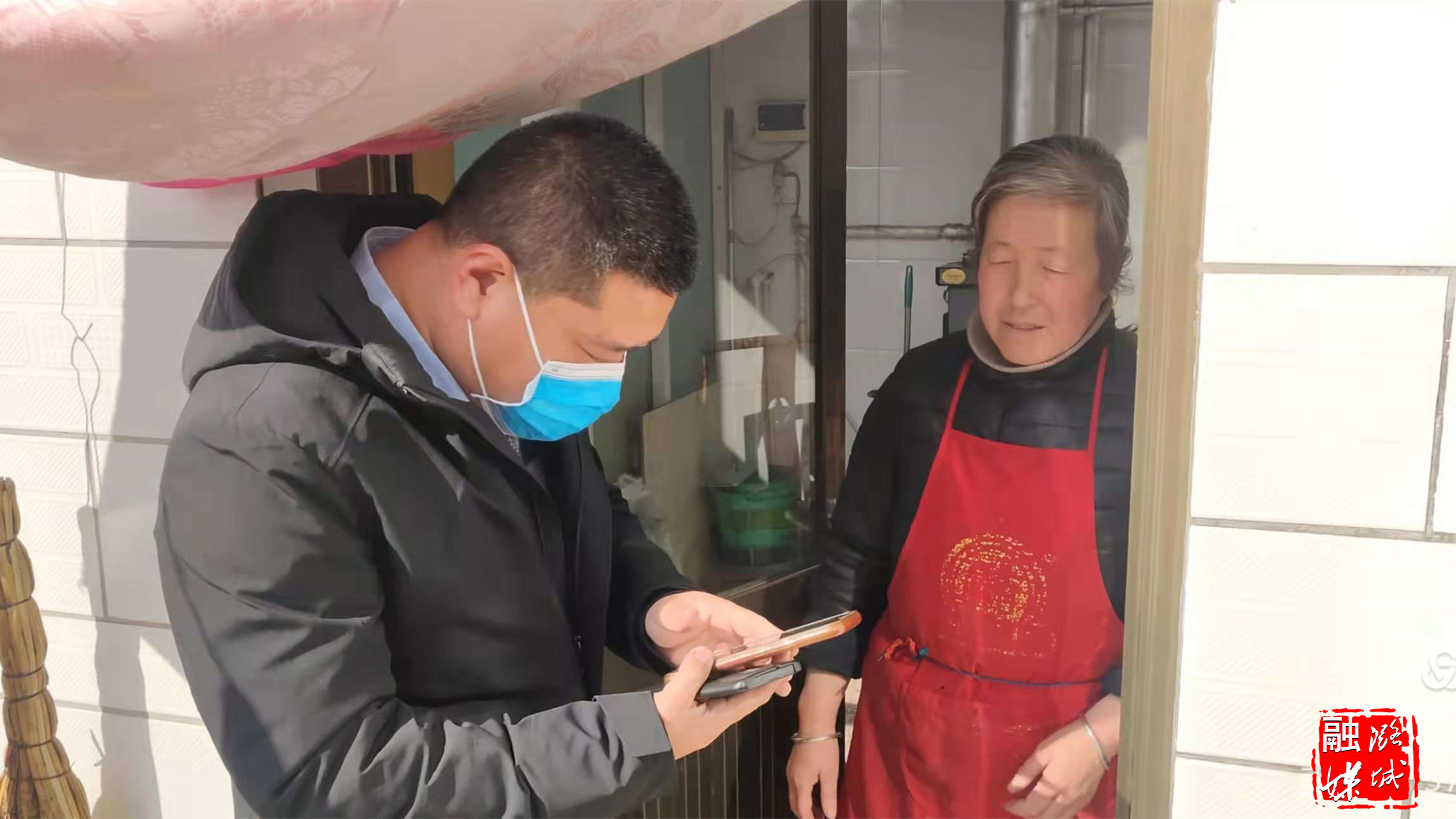 ▲区融媒体中心驻村工作队在辛安泉镇西流北村入户张贴健康码申请流程图,帮助脱贫户、监测对象注册晋快检和健康码,向村民宣传新冠疫苗加强针接种事宜。