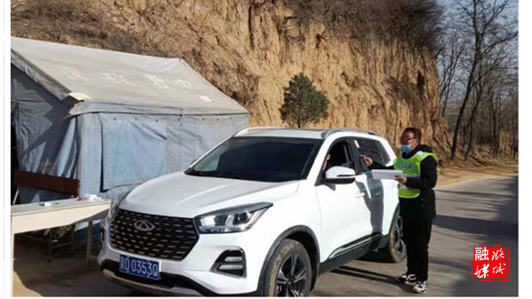 ▲成家川街道各村(社区)疫情防控人员在卡口排查登记外来车辆与人员。