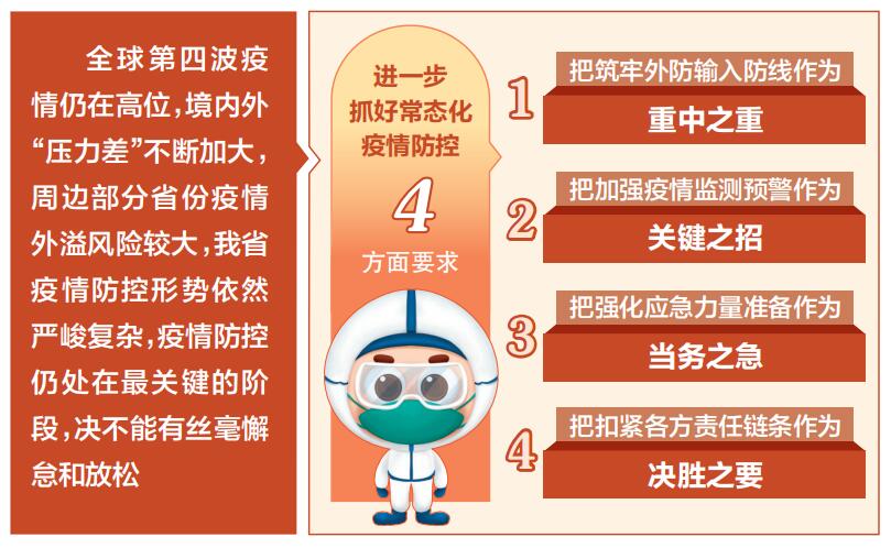 林武指出,一段时期以来,在省委密集部署、高位推动下,各地各有关部门迅速行动,紧紧依靠广大人民群众,成功应对处置了5起局部疫情燃点,维护了全省疫情防控形势总体平稳。同时也要看到,全球第四波疫情仍在高位,境内外“压力差”不断加大,周边部分省份疫情外溢风险较大,我省疫情防控形势依然严峻复杂,疫情防控仍处在最关键的阶段,决不能有丝毫懈怠和放松。