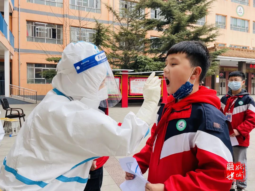 在城关小学的核酸检测现场,全副武装的白衣天使正耐心引导学生进行核酸检测。前不久,城关小学刚刚完成对全校一千五百余名学生的摸排工作,其中家长从事医疗、运输等重点行业的300余名学生被划分为重点学生,率先进行核酸检测。
