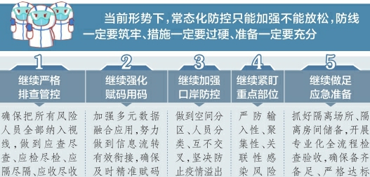 林武指出,当前形势下,常态化防控只能加强不能放松,防线一定要筑牢、措施一定要过硬、准备一定要充分。一要继续严格排查管控。强化属地“第一时间、第一落点”管控,不断完善“落地核酸+点对点转运+精准赋码”全链条工作机制,形成风险人群数据推送、比对、排查处置、核酸检测、信息反馈的闭环,确保把所有风险人员全部纳入视线,做到应查尽查、应检尽检、应隔尽隔、应收尽收。二要继续强化赋码用码。加强多元数据融合应用,努力做到信息流转有效衔接,确保及时精准赋码。严格落实健康码查验措施,坚决杜绝查验不严、虚晃一码等现象,执行好有关限制流动要求。要及时向社会公布本地健康码转码流程和服务渠道,做好及时转码有关工作,不能因赋码快但转码慢而影响群众生活。三要继续加强口岸防控。进一步强化国际航班接机全流程闭环管理和保障人员封闭管理,做到空间分区、人员分类、互不交叉,坚决防止疫情溢出。四要继续紧盯重点部位。从严抓好农村、学校、养老院、交通场站、商场超市、景区景点等地疫情防控工作,认真落实冷链物流和寄递物流防控措施,加快推广“抗原筛查、核酸诊断”检测模式,严防输入性、聚集性、关联性感染风险。五要继续做足应急准备。抓好隔离场所、隔离房间储备,开展专业化全流程检查验收,确保备齐备足、严格达标。要加快推进方舱医院建设图纸设计、设备采购、人员培训等相关准备工作,确保需要时能尽快建成投用。林武强调,要进一步提高科学防控、精准施策的能力水平,在紧抓不放、抓好落实的同时,坚决防止简单处置、层层加码,确保疫情防得准、控得住。
