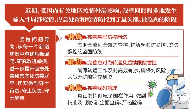 林武指出,近期,受国内有关地区疫情外溢影响,我省同时段多地发生输入性局部疫情,应急处置和疫情防控到了最关键、最吃劲的阶段。特别是要看到,一些地方疫情防控工作还存在入返晋卡口管控检查不严格、延伸溯源管理不到位、赋码验码工作不完善等薄弱环节。各地各部门都要进一步警醒起来,坚持问题导向,从每一个新增病例中查找短板漏洞、研究改进举措,进一步提升应急处置和常态化防控水平,切实做到守土有责、守土负责、守土尽责。要聚焦完善基层防控网络,强化“第一落点”管控责任,发挥好基层党组织和全科网格作用,第一时间掌握来返晋人员从卡口到村(社区)信息,实现全流程全覆盖管控,构筑起联防联控、群防群控的坚固防线。要聚焦完善点对点转运及后续跟踪管控,以县区为单位成立转运专班,统筹资源力量,严密转运流程,确保转运工作及时高效有序;强化转运工作与隔离点、健康驿站管理的全方位对接,并做好后续至少7天的管控工作,确保对风险人员无缝隙管控到位。要聚焦完善赋码管理,进一步强化现有赋码系统与通讯运营商基站信息的协同,真正发挥好电子围栏作用,做到精准及时赋码、全面查码、严格验码。