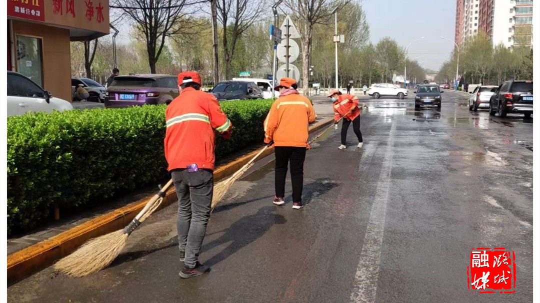 ★4月10日,区园林环卫中心对道路进行机械化清扫、绿化带清洗、道路清洗。