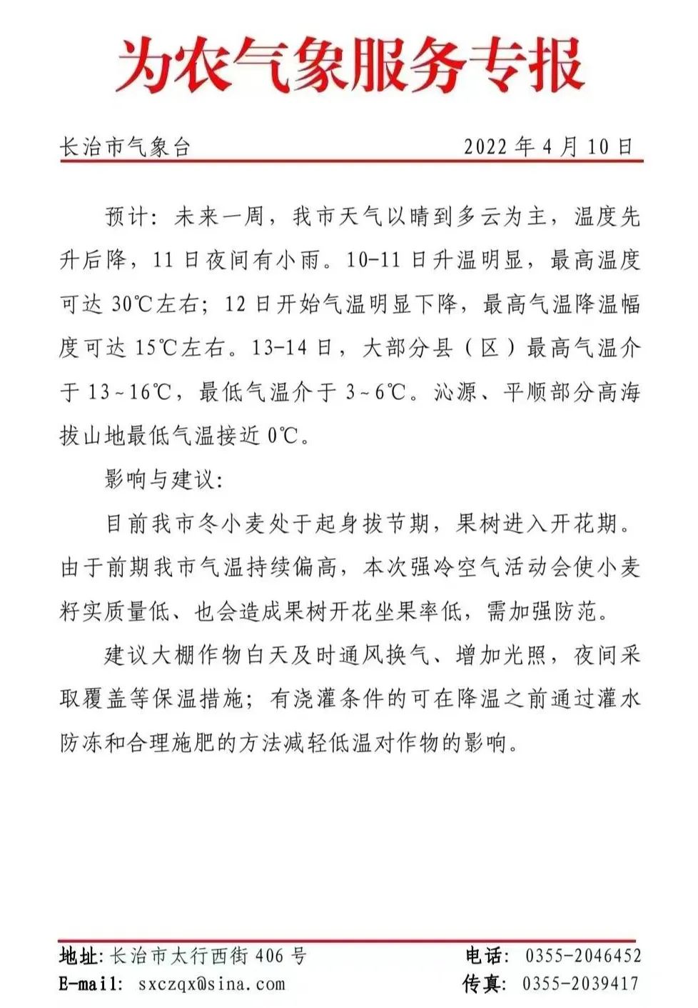 据市气象台预报 未来一周,我市天气以晴到多云为主 温度先升后降 11日夜间有小雨 10-11日升温明显 最高温度可达30℃左右 12日开始气温明显下降 最高气温降温幅度可达15℃左右 13-14日 大部分县(区)最高气温介于13-16℃ 最低气温介于3-6℃ 沁源、平顺部分高海拔山地 最低气温接近0℃ 此次大幅度气温变化过程 对小麦、蔬菜等 农业生产将产生一定不利的影响 ↓↓↓ 防范与应对 此次大幅度气温变化过程,对小麦、蔬菜等农业生产将产生一定不利影响,农民朋友要加强防范。 目前我市冬小麦处于起身拔节期,果树进入开花期。由于前期我市气温持续偏高,本次强冷空气活动会使小麦籽实质量低、也会造成果树开花坐果率低,需加强防范。 大棚作物白天要及时通风换气、增加光照,夜间要采取覆盖等保温措施;有浇灌条件的可在降温之前通过灌水防冻和合理施肥的方法减轻低温对作物的影响。 畜禽养殖要做好弱幼畜禽防寒保温工作,加强动物疫病防范。 蔬菜预防倒春寒技术措施 1.密切关注天气预报。通过广播、电视、手机短信、微信等媒体,及时关注掌握天气变化情况,增强安全意识和风险防范意识,及早做好低温大风降水等灾害天气应对措施。 2.保护加固棚体。要及时检查设施骨架,维修更换锈蚀、灾害损坏变形的棚架;抗压能力差的棚室,应及早加设立柱并加固整修;土墙日光温室后屋面要加盖薄膜。 3.植株管理。定植缓苗后适当控水并划锄土壤,然后进行地膜覆盖;操作性覆盖稻壳、玉米秸秆或地膜全覆盖等;晴好天气进行整枝和落蔓,摘除老叶病叶;无生长点的枝蔓可留侧枝结果,根据植株长势和天气情况决定留果数量。 4.保温增光。棚室内搭建简易中棚、小拱棚进行多层覆盖;通风口处和棚门口设置缓冲薄膜;棚室外更换保温效果好的新棉被或加盖保温被;棚室四周围挡多层覆盖物防风保温;当喜温蔬菜的棚室气温持续低于5℃、喜冷凉蔬菜的棚室气温持续低于0℃时,立即进行电暖气、自动加热风机、空气加热线、电热鼓风炉、应急增温燃料块等临时辅助加温。在保证蔬菜适宜生长温度的前提下,尽量早揭晚盖棉被以延长光照时间;遇到连续阴雨天气时,只要不下雨也要把棉被拉起见光;及时清理棚膜上的雾滴、灰尘。 5.防控病虫害。密切关注病虫害发生危害情况,及时发现并清除中心病株,选用烟剂或粉剂开展防控。主要预防低温高湿病害,注意防治蚜虫、白粉虱、蓟马、螨类等害虫,可悬挂黄板蓝板诱杀,需用药时可选择阿维菌素、螺虫乙酯、呋虫胺、吡虫啉、乙基多杀菌素等。 6、及时采收。不管是露天种植的还是大棚里的蔬菜,已可采收的,应都尽量采收,存放在室内,分批上市,以减少损失。 长治市果蔬中心 小麦预防倒春寒技术措施 当前,小麦处于起身拔节期,遭遇倒春寒极易发生冻害,应采取各种措施防范。寒潮发生前。防止春季冻害最有效措施是密切关注天气变化,在降温之前浇水。因此,有浇灌条件的地区,在寒潮来前进行浇水,通过调节近地面层小气候,来防御早春冻害。没有水浇条件的旱地麦田要进行叶面喷肥(水)进行预防。 冻害发生后,可根据冻害发生程度分类指导。对于少部分叶片受冻麦田可采取中耕划锄,提高地温,促进发育;对于叶片受冻严重,但墒情较好麦田可采取中耕锄划,配合叶面喷施叶面肥、植物生长调节剂等措施补救;对于墒情较差麦田,应采取浇水并亩追施5公斤尿素,促进叶片生长,增加干物质积累;对于分蘖受冻死亡的麦田,应立即浇水并亩追7.5公斤尿素和2.5公斤磷酸二铵,以增加分蘖,使小蘖赶大蘖,提高成穗率,增加亩穗数,减少损失。 长治市农技推广中心 中药材预防倒春寒技术措施 近期,将会有一次大幅度的降温,为了避免中药材受到不同程度的冻害。尤其是连翘、山茱萸等开花较早的中药材要重视做好防护工作。应在合理施肥、灌水和枝条修剪、越冬管理的基础上,采取以下防治措施: 一、预防措施 1.做好生产管护。对中药材育苗设施大棚,白天及时通风换气、增加光照,夜间采取覆盖保温措施,避免种苗受冻害。低温过后及时做好清沟排水,防止渍害发生。 2.灌水防冻。效果与灌水时期有关。越接近霜冻日期,灌水效果越好,最好在霜冻发生前一天灌水。 3.科学合理施肥。根据不同药材的生长情况,合理增施有机肥、磷钾肥,积极应用无烟草木灰(焦泥土)等提高植株抵抗力,促进药材尽快恢复生长。同时做好培土,减轻冻害发生。 4.提高抗逆性。雨雪降温天气来临前,提前3天喷施防冻液,提高抗逆性。 二、补救措施 1.倒春寒后及时清理植株上的积雪,以免冻害,同时修被雪折断植株。并做好凊沟排水,有条件的可进行浅松土,降低田间湿度,有利土壤升温,使植株迅速恢复生长。 2.及时做好病虫害防治。受冻害药材植株长势较差,抵抗力较弱,易加重病虫害的发生。重点防治菌核病、根腐病等病害。 3.加强技术指导服务。发生灾害后,各主产区生产技术部门要及时在农业保险、企业贷款、种苗补救、恢复生产信心等方面做好咨询和服务。 长治市中药材产业发展中心