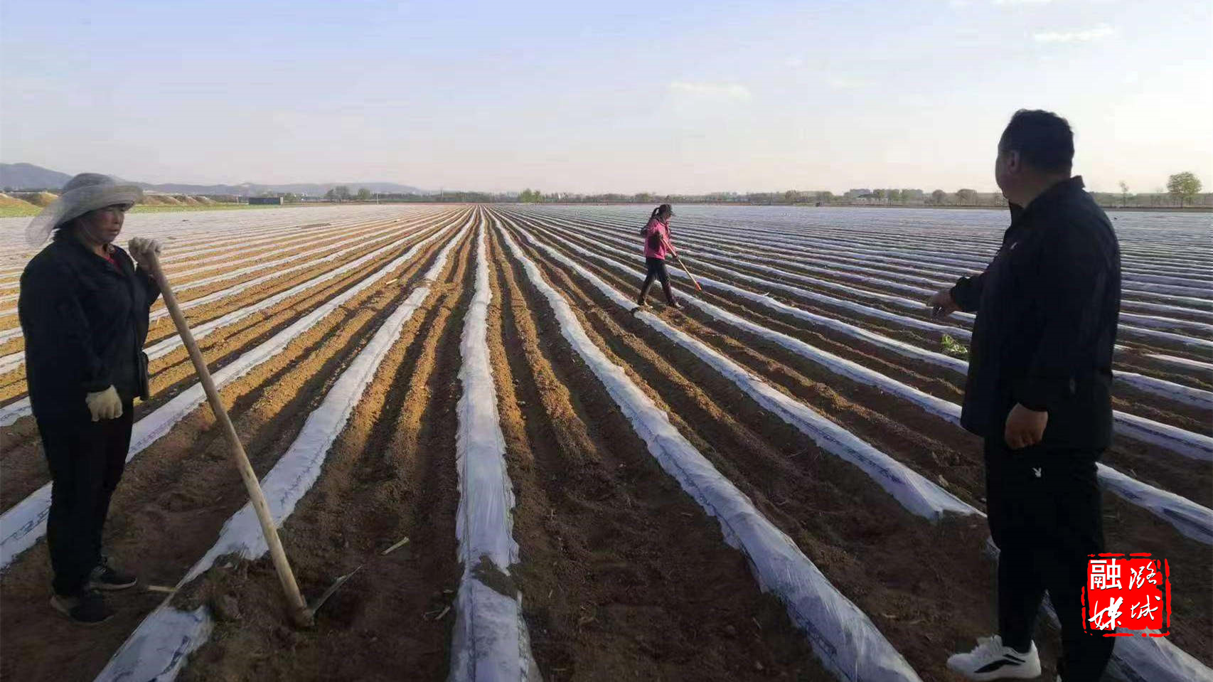 ▲翟店镇西天贡村紫甘蓝、尖椒等蔬菜作物已经下苗,镇村两级干部深入田间地头指导覆膜。