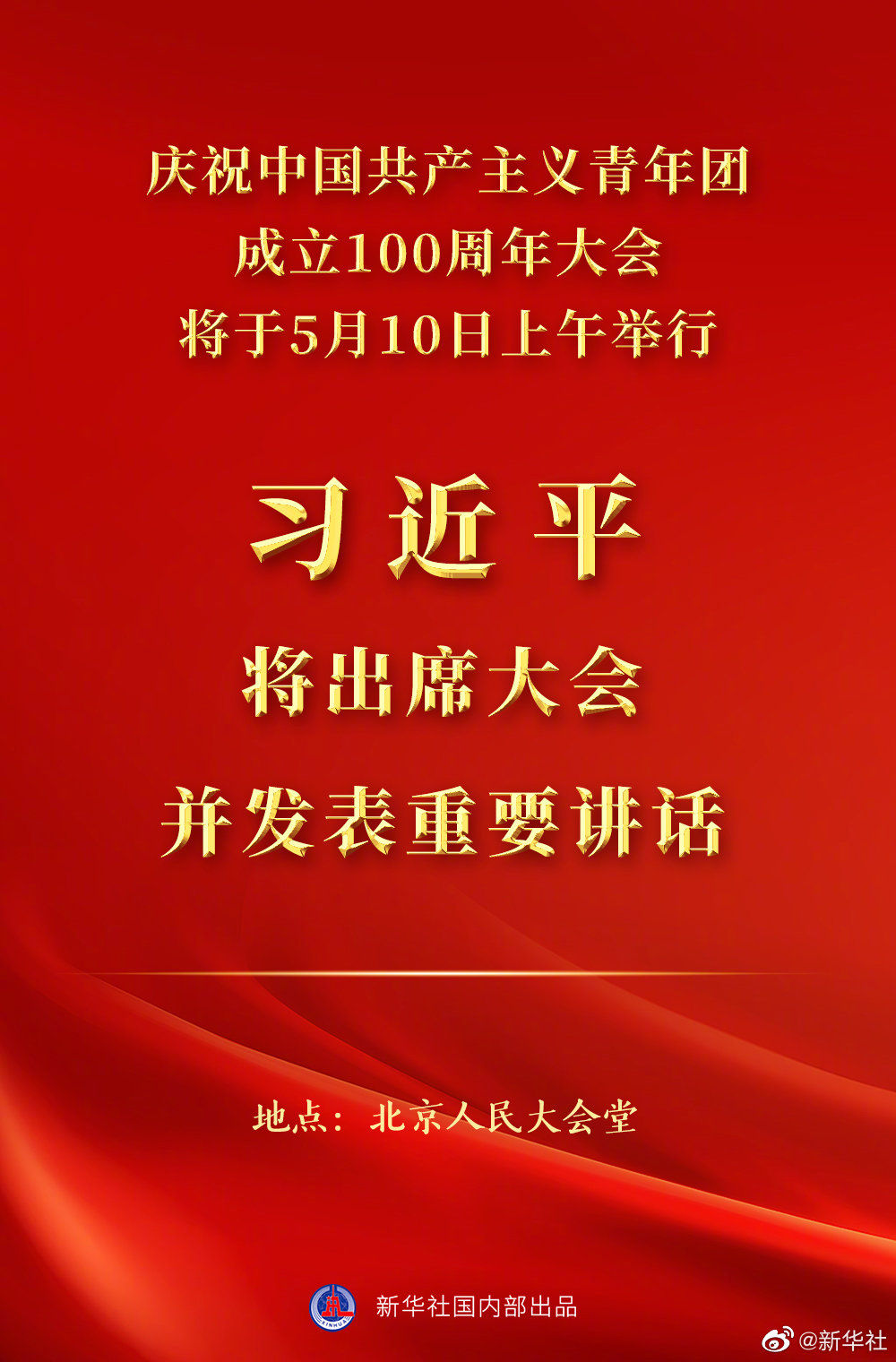 新华社北京5月8日电 庆祝中国共产主义青年团成立100周年大会将于5月10日上午在北京人民大会堂隆重举行。中共中央总书记、国家主席、中央军委主席习近平将出席大会并发表重要讲话。