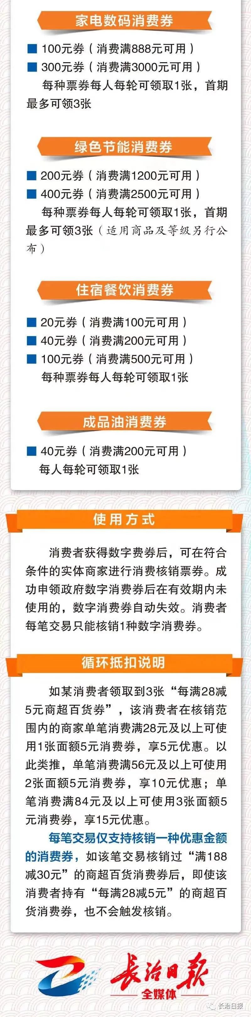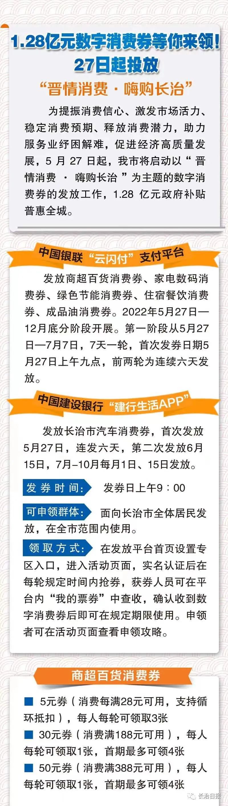 在“云闪付”支付平台发放第一阶段的长治市政府消费券,细分为商超百货、数码家电、 住宿餐饮和成品油券四大种类,抢券时间为每周五上午9时,面向长治市全体居民开放。