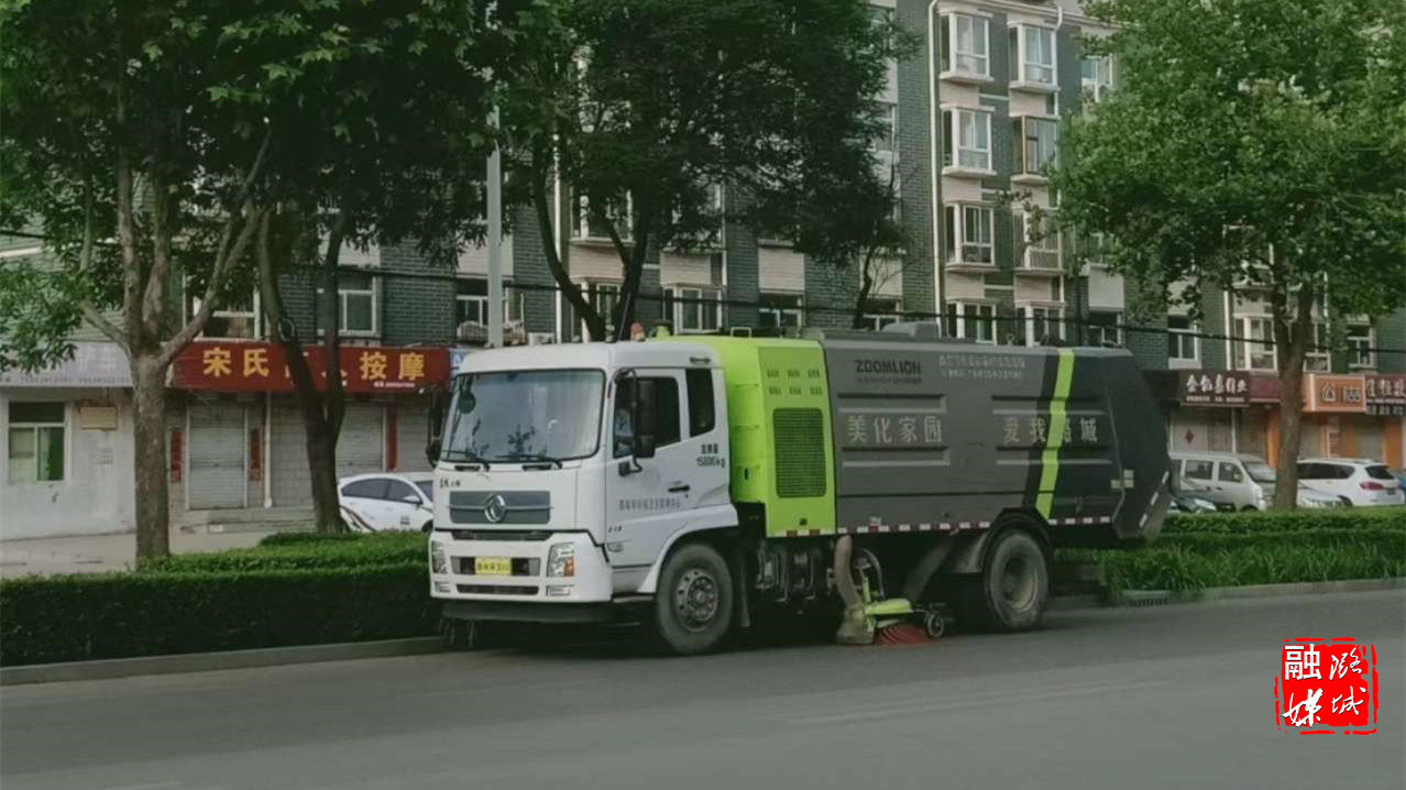▲区园林环卫中心对辖区道路进行机械化冲洗、清扫。