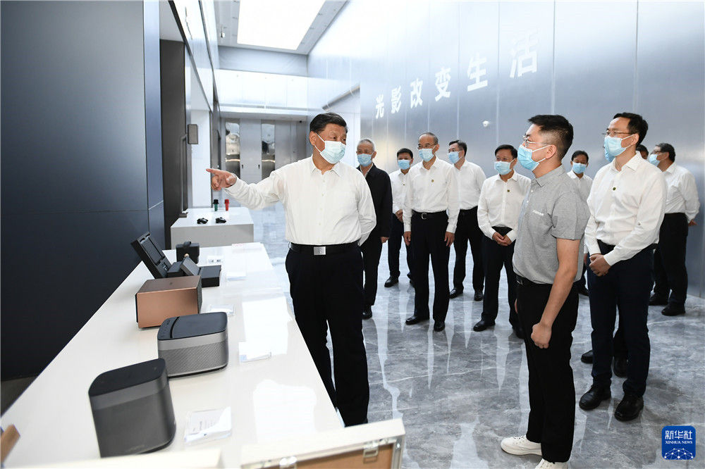 随后,习近平考察了极米光电有限公司。他走进公司展厅和生产车间,了解企业加强自主创新、产品研发销售、带动就业和当地支持民营经济发展、出台纾困帮扶政策等情况。习近平强调,推进科技创新,要在各领域积极培育高精尖特企业,打造更多“隐形冠军”,形成科技创新体集群。