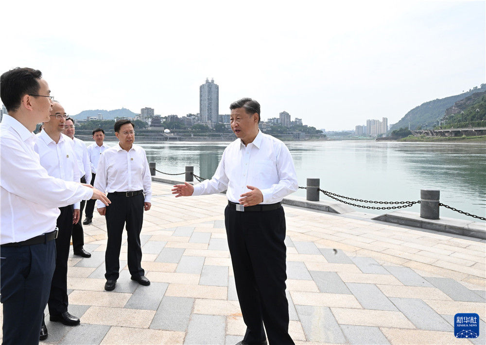 6月8日,中共中央总书记、国家主席、中央军委主席习近平在四川考察。这是8日下午,习近平在宜宾市三江口考察,听取当地推进长江流域生态修复保护等情况汇报。新华社记者 李学仁 摄